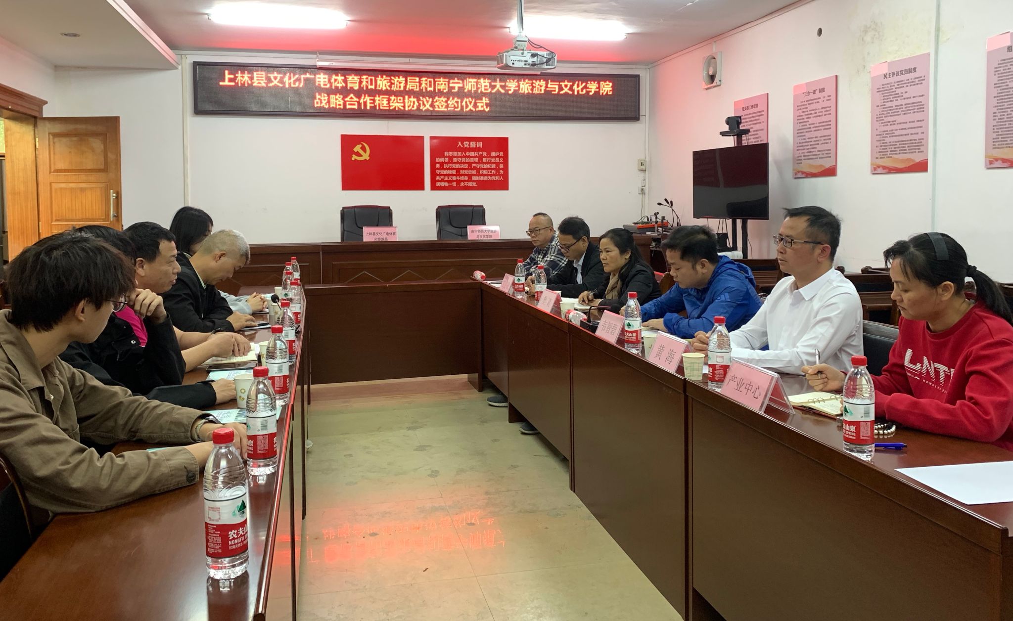 2024年11月20日,太阳成集团tyc师生代表在经理段文军带领下抵达上林县文化广电体育和旅游局二楼会议室,与上林县文广体旅局共同举行战略合作框架协议签约仪式。此次签约标志着太阳成集团tyc在文化、旅游等领域与地方合作开启深度合作新篇章,旨在整合双方资源优势,凭借高校的专业学术力量与人才储备,推动地方文旅产业升级,并促进公司在文旅产业相关的人才培养模式与实践的协同发展。