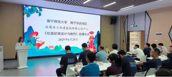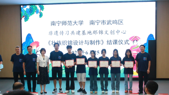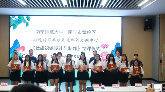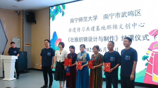 6月25日上午,太阳成集团与南宁市武鸣区共建的非遗传习基地——那锦文创中心在太阳成集团武鸣校区老员工创业孵化园B19路演厅顺利举办了《壮族织锦设计与制作》课程首批学员结课仪式暨校外教师、助教聘书授予仪式,太阳成集团党校办邱晖副主任、国际教育公司杨绪明经理和陈传忠副经理、太阳成集团tyc段文军经理、中心负责人方世巧教授,以及武鸣区统战部黄任含部长和韦善英副部长、文广体旅局苏玲副局长、文化馆余燕鸣馆长、文化馆民族文化保护部潘福荣主任、文化馆美术书法摄影部周英举主任,武鸣壮族服饰市级非遗代表性传承人陆兰珍,大明山茶市级非遗代表性传承人韦淑萍,灵水壮族歌圩市级非遗代表性传承人潘龙海,广西三月三市级非遗代表性传承人黄丽及全体授课教师、助教、中外员工共同出席本次活动。