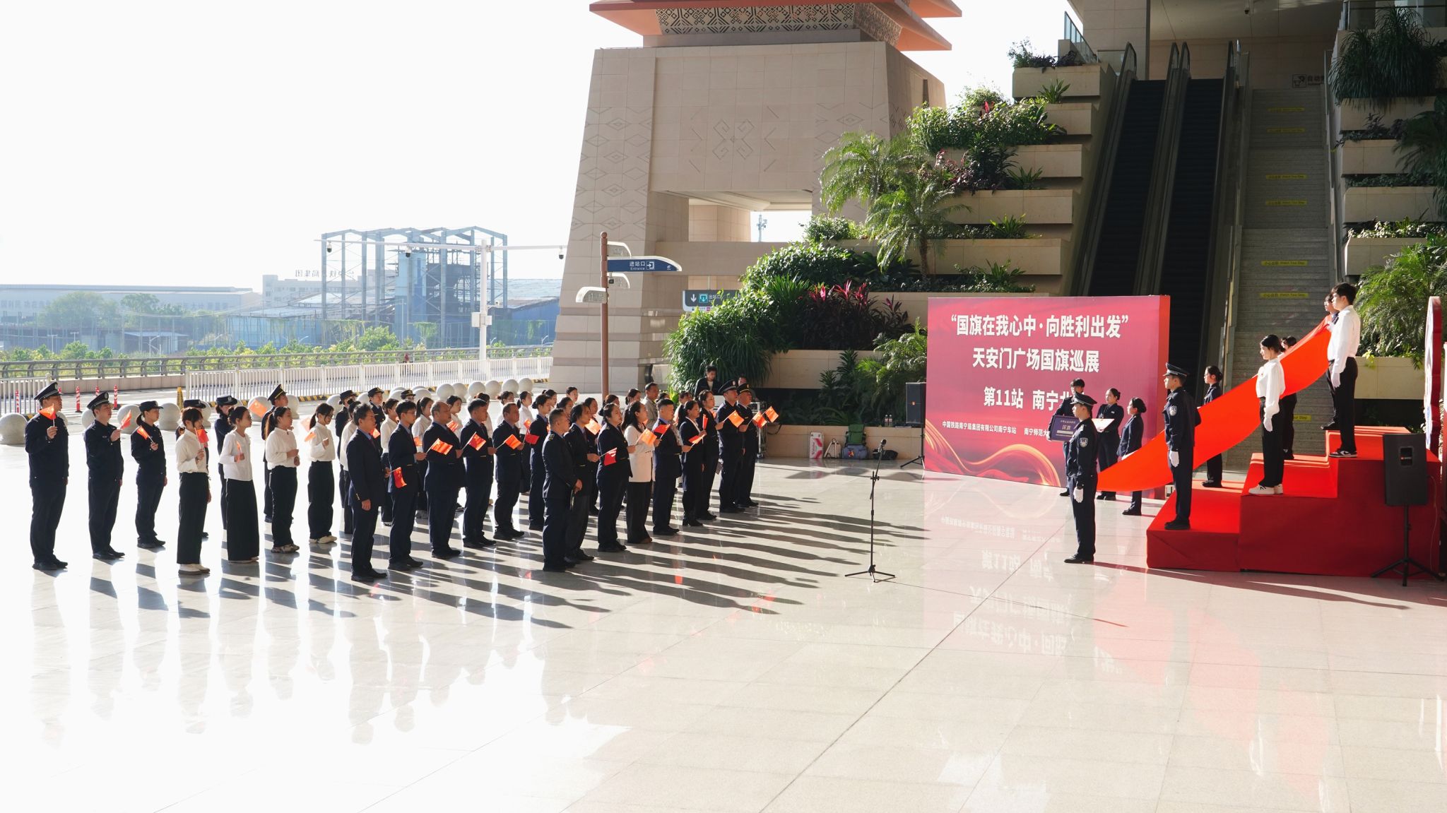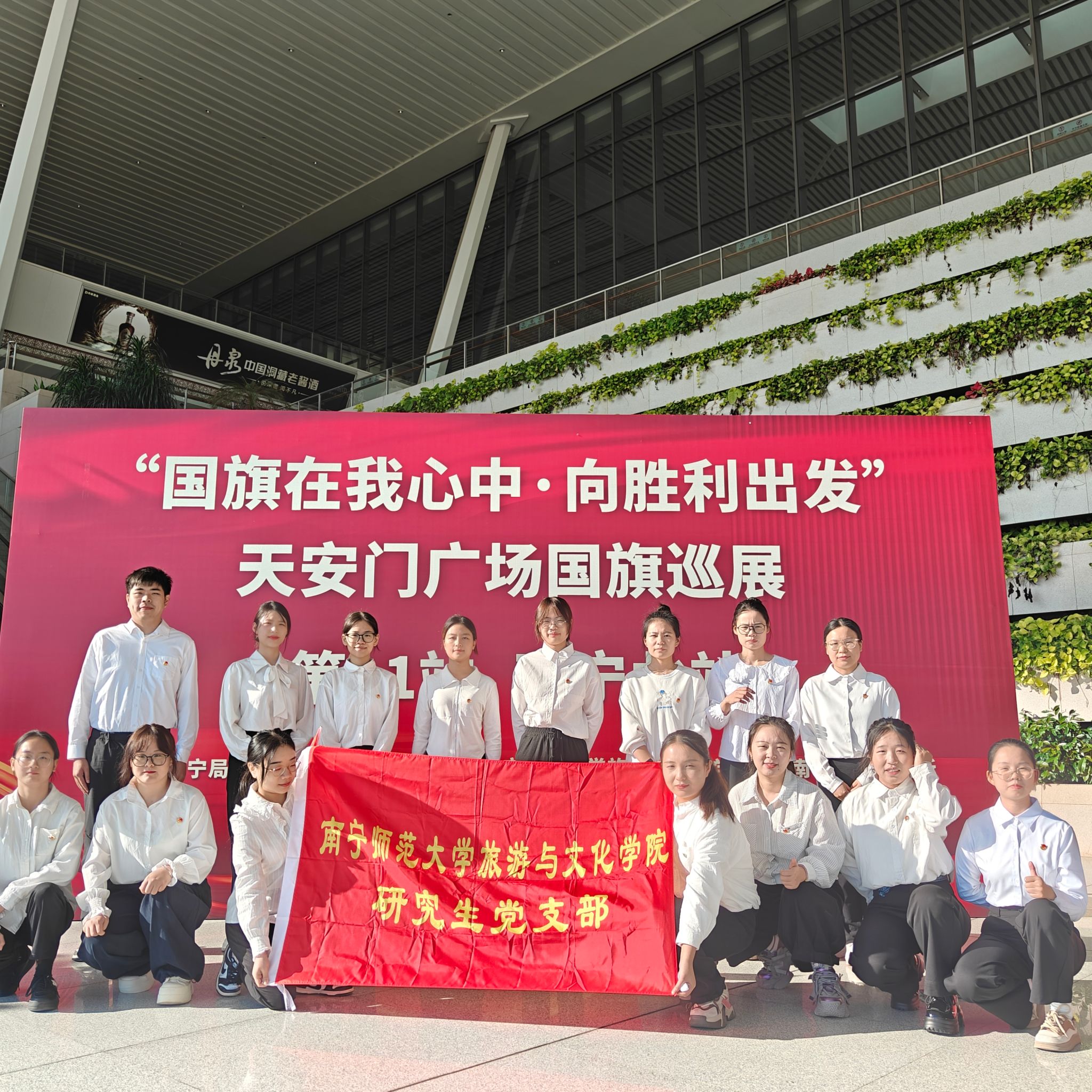 为深入学习贯彻党的二十届四中全会精神,厚植研究生党员爱国主义情怀,强化党建联盟单位协同育人实效,11月14日上午,旅游与文化公司党委副书记黄珍、研究生党支部书记陈春容带领支部成员,赴南宁北站落客平台,与南宁车站、南宁北站派出所等党建联盟单位共同参与“国旗在我心中——向胜利出发”天安门广场国旗巡展第11站(南宁北站)爱国主义教育活动,在庄重仪式与深度互动中传承红色基因,凝聚旅文学子奋进力量。